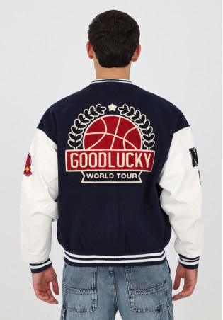 Ce blouson teddy en velours de laine allie style rétro et allure sportive. Son design bicolore bleu marine et blanc se distingue par ses écussons brodés façon université américaine. Doté de manches contrastantes, d’une fermeture à boutons pression et de finitions côtelées rayées, il offre confort et modernité pour un look urbain affirmé et tendance.