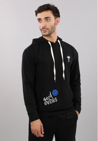 Le hoodie en molleton noir est idéal pour un look urbain décontracté.Doté d'une capuche ajustable avec cordon de serrage en beige, et de patchs tissés représentant "Snoopy" et "Smile" aposés au niveau de la poitrine pour une touche ludique et positive. L'impression "Good Vibes" sur la poche kangourou renforce cette sensation de joie et de détente. Accordé avec un jean ou un jogger.